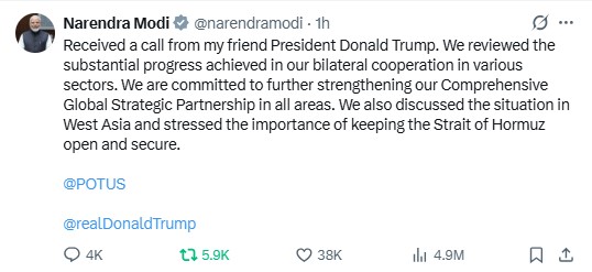 NEW DELHI : PM Modi spoke with US President Trump, reviewing bilateral ties and stressing the security of the Strait of Hormuz amid West Asia concerns.